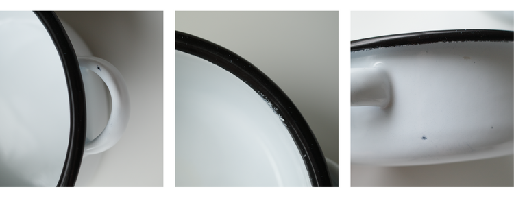 - 법랑 제품은 수공 제작 특성상, 표면의 작은 기포, 미세한 스크래치, 바늘구멍, 도막 두께 차이, 검은 반점 등이 있을 수 있습니다.